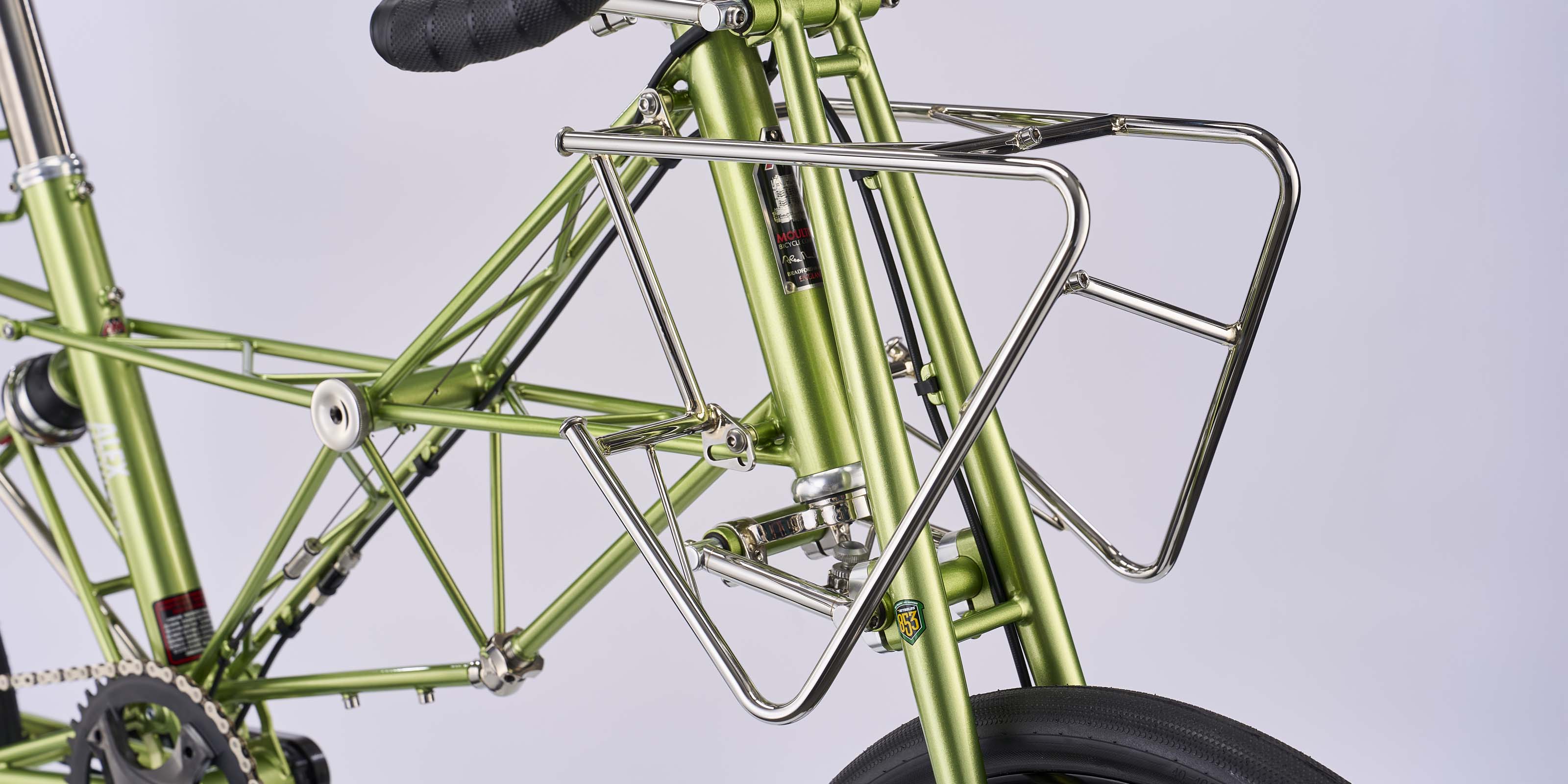 Designed specifically to fit neatly around Moulton’s front Flexitor suspension system, this polished stainless steel carrier combines precise engineering with elegant, purposeful design. Crafted from high-quality stainless steel and finished to a mirror polish, it offers outstanding corrosion resistance while enhancing the distinctive character of the NS range of Moultons. Its bespoke geometry ensures secure mounting without interfering with suspension performance, preserving both ride quality and overall stability.